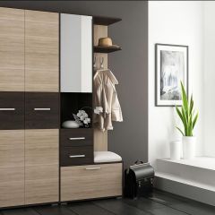 Прихожая компактна, занимает немного места. Прихожая содержит все элементы, необходимые для создания комфорта во входной зоне.